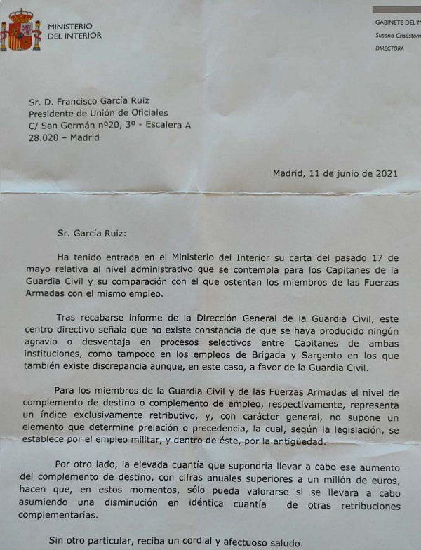 Nos DECEPCIONA, y lamentamos, no contar con el apoyo de nuestra Dirección General, con Dª María Gámez a la cabeza, y que no sea la primera que defienda con uñas y dientes que un Oficial de la Guardia Civil no puede tener menor consideración que uno de las FAS o que un Inspector de Policía. Al contrario, justifican que no hay ningún perjuicio.